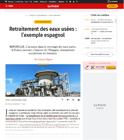 El “buen hacer” de la ciudad de Alicante en preservación del recurso hídrico ha despertado recientemente algunas visitas de medios de comunicación internacionales, procedentes de países europeos, como Francia, o latinoamericanos, como Chile, que se han mostrado interesados en plasmar en sus respectivos espacios de difusión cómo está trabajando Alicante en el cuidado del agua desde el punto de vista de la reutilización y qué le ha convertido en referente en este sentido. Junto a directivos y técnicos, tanto de Aguas de Alicante, como del propio Ayuntamiento, los periodistas visitantes han recorrido lugares receptores del agua regenerada, como son el Parque Inundable La Marjal, las instalaciones del Sindicato de la Huerta de Alicante, el Campo de Golf de la Playa de San Juan…, entre otros, y que son claro ejemplo de todo lo que puede lograr esta segunda vida para agua, gracias a su reutilización.
