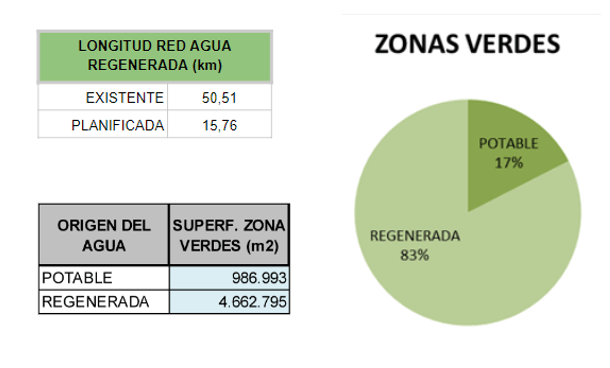 Como ejemplo, 4.662.795 m2 de zonas verdes disponen en la actualidad de acceso al riego con agua regenerada, lo que equivale a un 83% de la superficie total de las zonas verdes existentes en la ciudad de Alicante.