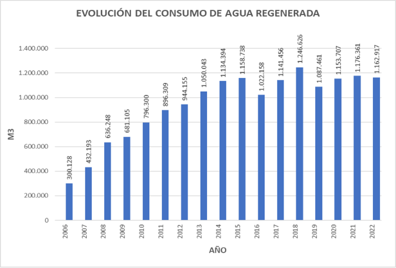 Durante el año 2022, el volumen total de agua regenerada suministrado para usos urbanos fue de 1.162.917 m3 (1.123.906 m3 en Alicante, excluyendo San Vicente del Raspeig).